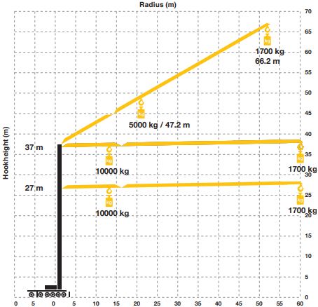 - Maximální délka ramene 51,5 m max. zátěž 2,100 kg